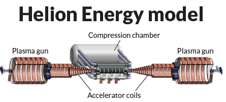 Just a few miles from Microsoft’s headquarters outside Seattle, Helion Energy wants to fuse deuterium and helium-3 to produce energy plus hydrogen and helium-4 nuclei, but no neutrons. Pulsed magnetic fields would compress and heat the plasma to fusion temperatures for a brief instant.
