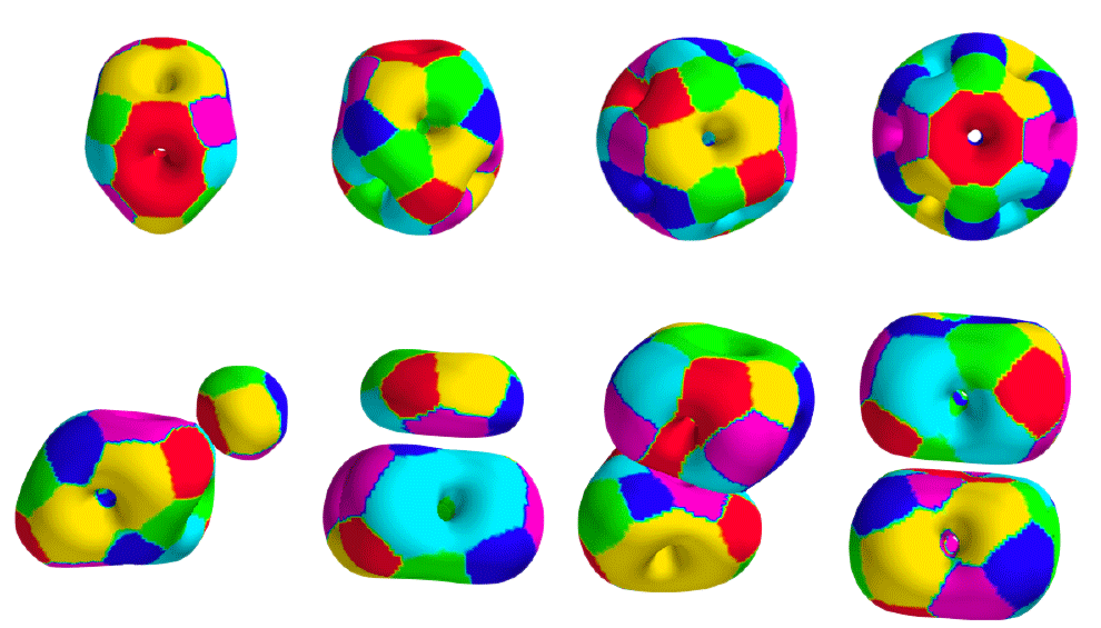 Skyrmion calculations typically neglect heavier particles called rho mesons that are also important for keeping nuclei intact. Including those particles in the calculations changes how the skyrmion “knot” in the field gets tied, and the shapes of the resulting nuclei, says mathematical physicist and study coauthor Paul Sutcliffe. It’s as if the knots were tied in “a boring piece of string before, and now it’s … a colored string with some sparkles on it.” As a result, “you now get the right shapes,” he says.