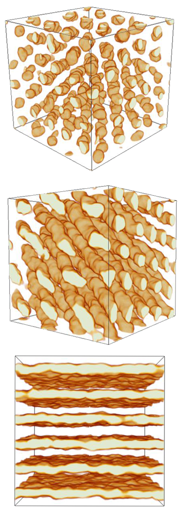 When atomic nuclei get squeezed together inside a neutron star, globs of nuclear matter form into shapes reminiscent of various types of pasta, including gnocchi (top in these simulations of nuclear pasta), spaghetti (middle) and lasagna (bottom).