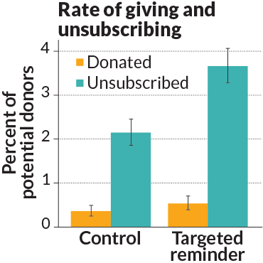 A case in point is a study submitted for publication by Damgaard and behavioral economist Christina Gravert of the University of Gothenburg in Sweden. E-mailed donation reminders sent to people who had contributed to a Danish anti-poverty charity increased the number of donations in the short term, but also triggered an upturn in the number of people unsubscribing from the list.