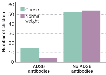 Not only were obese children more likely to have antibodies to the virus — 22 percent of obese children had antibodies compared with 7 percent of normal-weight kids — but the obese kids with evidence of prior adenovirus-36 infections were on average about 35 pounds fatter than obese children who hadn’t caught the virus.