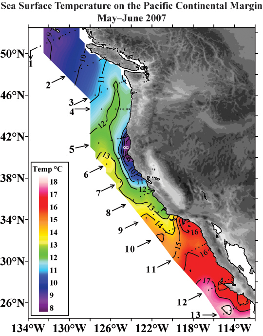 Some colder water normally rises toward the sea surface along the coast at this time of year, says coauthor Christopher Sabine, also of NOAA’s Seattle lab. Spring and summer wind patterns nudge surface waters westward, drawing up water from 150 to 200 meters below the surface.