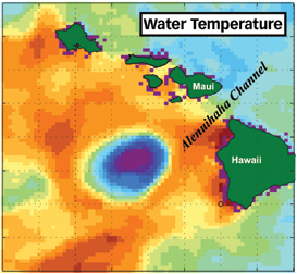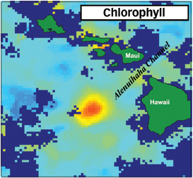 The centers of anticyclonic, warm-core ocean eddies typically are zones of downwelling and therefore are nutrient-deficient. However, fluid friction along the edges of these whorls can create counter-rotating eddies that bring cool, nutrient-rich waters to the surface. Also, the swirling action of warm-core eddies can entrain and concentrate cooler waters–and their biological inhabitants–from surrounding ocean regions.