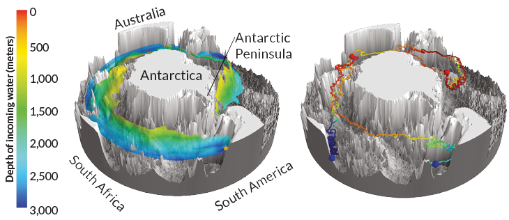 A mass of water called the North Atlantic Deep Water enters the Southern Ocean off the southeast coast of South America (star in map below left). That water is relatively warm and salty compared with other water in the ocean, so researchers could map its path upward and around Antarctica. Then, using simulations, researchers tracked virtual particles traveling in such deep water as it upwells around the continent (below right, two examples shown; blue and red dots indicate start and finish of the paths of two particles).
