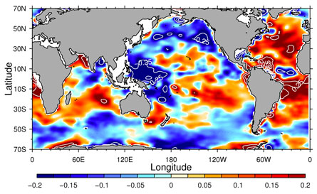 Over the second half of the 20th century, parts of the world’s ocean became saltier (red) and parts became fresher (blue) as the amount of water evaporating from the surface and falling as rain increased.