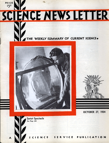 Scientists of Soviet Russia are entering the field of telescope-lens construction. The cover illustration of Science News Letter this week shows a technician examining an 82-centimeter (nearly 33 inches) diameter lens.