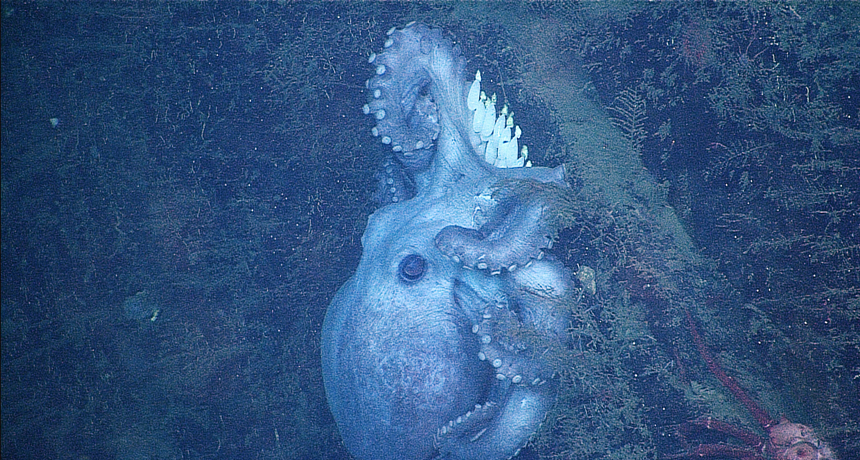 DEVOTED MOM This deep-sea octopus is settled over her eggs on the side of a rock face in the Monterey Submarine Canyon. Scientists observed her brooding the same clutch of eggs for nearly four and a half years.