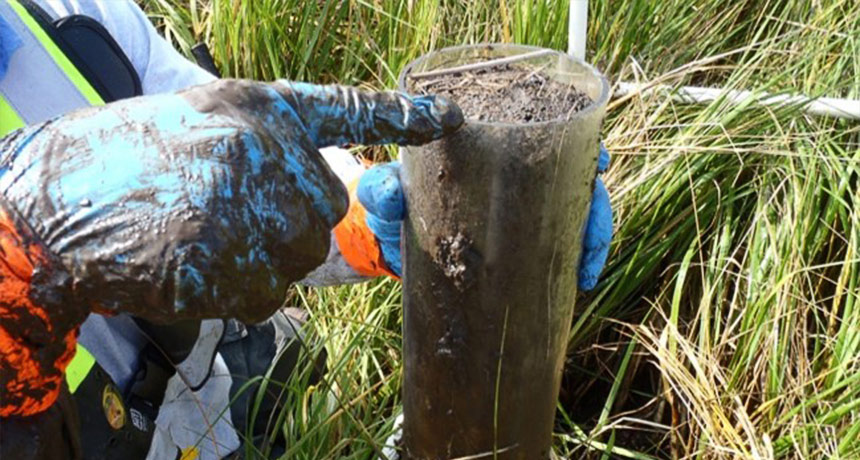 OIL SPOILS In cores of sediment like this one pulled from a Louisiana marsh, researchers found busy microbes gobbling up oil from the 2010 Deepwater Horizon oil spill.