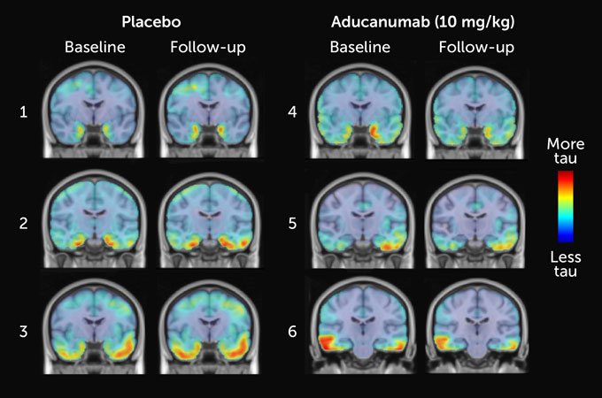 People who received placebo had more tangles of a protein called tau (red) in certain parts of their brain than people who received the drug aducanumab, a small analysis finds. Shown are three representative brain scans of people who received placebo (left) and people who received the highest dose of aducanumab (right).
