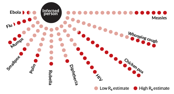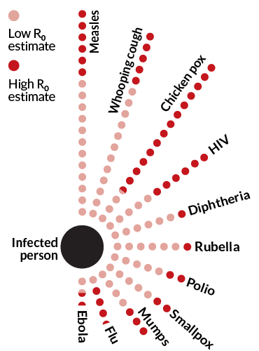 Those numbers are scary, but another number, or rather a range, illustrates the potential of these diseases to do damage. It’s called the basic reproduction number, or R0 (pronounced “R naught”), a ratio that describes the contagiousness or transmissibility of an infectious disease. If one person is infected in an unvaccinated population, R0 gives an estimate of how many people would get sick from that individual, on average. Researchers can use R0 to estimate things like the size of an outbreak, the infectiousness of an emerging disease or the effectiveness of tactics against a hypothetical bioterrorism threat.