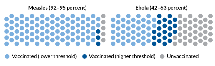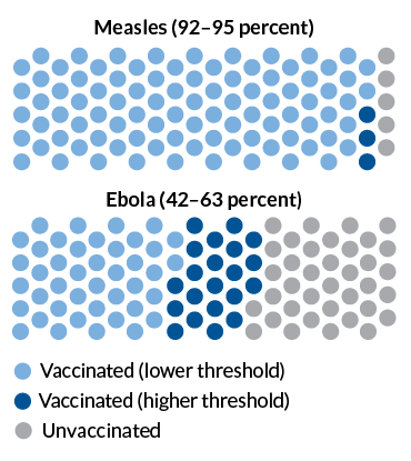 R0 can also be used to determine the fraction of the population that needs to be vaccinated to prevent a particular disease from spreading, known as herd immunity. Because measles is so contagious, 92 to 95 percent of a population needs to be vaccinated (left). Below that threshold, pockets of the unvaccinated create holes in that herd immunity, helping the virus spread, as recent U.S. measles outbreaks have shown. For Ebola, the threshold is lower. Estimates suggest that roughly 42 to 63 percent of a population needs to be vaccinated to achieve herd immunity (right).