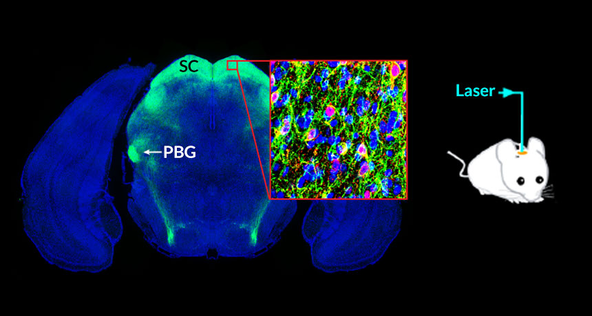 BUNDLE OF NERVES When parvalbumin-positive neurons (pink in box) nestled in the mouse brain’s superior colliculus (SC) were stimulated by a laser, they carried threatening information to a brain region called the parabigeminal nucleus (PBG). Image shows a slice of the brain from the top of the head to the bottom.