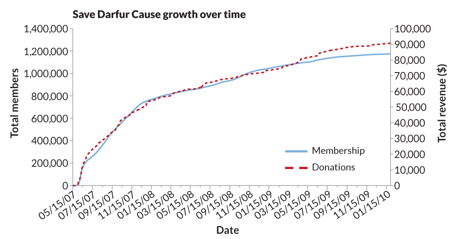 During those 989 days, nearly 1.2 million people joined the Save Darfur Cause on Facebook. Of that number, about 81 percent were recruited by other members. The rest signed up independently.
