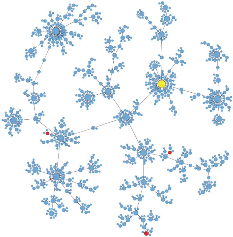 This is a 1,021-member subset of the recruitment network of the Save Darfur Cause. Larger nodes are members who recruited more people to the cause. Lines show recruitment links among members. The initial recruiter is the yellow dot. Only four people (red dots) in this network donated money and 71 percent recruited no one.