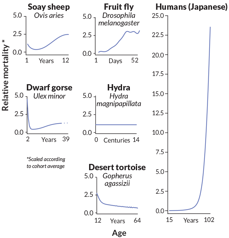 Across the tree of life, aging now looks more varied than old ideas predicted. Drawing on data for 46 species, Vaupel, Baudisch (now at the University of Southern Denmark in Odense) and 12 coauthors published a paper in 2014 featuring a full page of mortality curves, which track how the number of deaths in a given group changes over time. Many of the organisms show the expected upsweep with time, but other curves are idiosyncratic. The curve of Soay sheep curls concavely downward during early adulthood before rising again to a rounded hilltop in old age. Alpine swifts’ curve looks like a side view of a lawn chair relaxed way back for a summer snooze.
