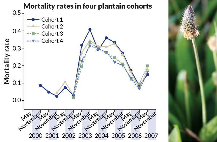 After collecting seven years of data on when plants died, Roach picked up a subtle signal she hadn’t observed in Durham. At first, plantains of different ages had about the same mortality rates, all relatively low, with six-month mortality rates at less than 10 percent. But during the three years that followed, the plantains clearly struggled. Roach suspects soggy winters plus competition from neighboring foliage were to blame. Death rates rose to around 30 percent and — this was the important bit — the death rates climbed higher for the older plants. A population that had looked as if it weren’t physically declining with age showed signs of senescence when the going got tough.