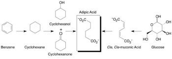 Although the processes developed by the Japanese scientists and the Fluor Daniel researchers are more environmentally friendly than the traditional way of producing adipic acid, they still use nonrenewable petroleum products as their raw materials. Karen M. Draths and John W. Frost, both chemistry professors at Michigan State University in East Lansing, have harnessed several techniques of green chemistry to develop an approach that overcomes this disadvantage.