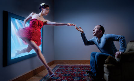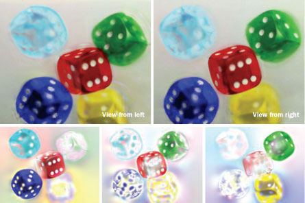 ADDING UP By layering individual images, researchers can create a composite 3-D image that looks different depending on the viewing angle. Images of dice mid-tumble (bottom three) are used to create a composite that looks different when viewed from the left than from the right (top two).
