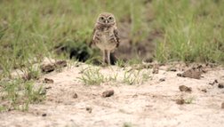 THEY WILL COME. A burrowing owl spreads dung around its burrow, attracting beetles. R.