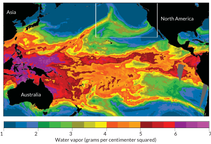 This map shows the level of water vapor in the atmosphere on March 20, 2011 (seven is highest, one is lowest). The white box highlights an atmospheric river (green) hitting the coast of California.
