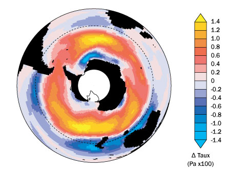 The average results of the two scenarios differ little from 1975 to 1986.. From 1987 onward, however, wind speeds over the high-latitude southern oceans were higher in the ozone-hole scenario than in the simulations that lacked an ozone hole. Differences between the scenarios became larger with every passing year, the researchers report. In the ozone-hole scenario, wind speeds in some areas were 60 percent higher in 2004 than they had been in 1975.