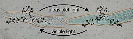 In the case of the tiny, transparent C. elegans, the scientists don’t know exactly how the compound paralyzed the worm, says study leader Neil Branda of Simon Fraser University in Burnaby, Canada. The team incubated the nematodes in dishes laced with a version of dithienylethene that is colorless and has an open ring at its center. When exposed to ultraviolet light, this center ring closes, altering the way the molecule’s other parts stick out. After a few minutes of ultraviolet light, the worms that had eaten the open-ring version began to turn blue and showed signs of paralysis. In many of the worms, exposure to visible light reversed the paralysis and hue, though some worms died.