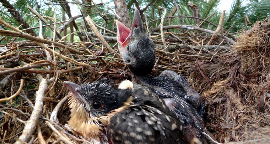 In the new study, researchers analyzed the fates of 741 carrion crow nests at a rural study site in Spain over the course of 16 years. Nests with at least one cuckoo chick in them were more likely (76 percent versus 54 percent) to succeed in fledging at least one of the crow nestlings than nests with no cuckoo chicks were. There was a cost, though: Among the nests that survived, those with cuckoo chicks fledged on average only 2.1 crows, fewer than the 2.6 fledglings in nests without an intruder..