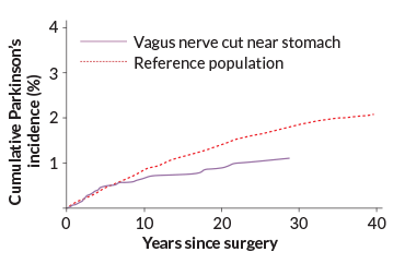 To look at this idea another way, researchers have examined what happens to Parkinson’s risk when people have a weak or missing vagus nerve connection. There was a time when doctors thought that an overly eager vagus nerve had something to do with stomach ulcers. Starting around the 1970s, many patients had the nerve clipped as an experimental means of treatment, a procedure called a vagotomy. In one of the latest studies on vagotomy and Parkinson’s, researchers examined more than 9,000 patients with vagotomies, using data from a nationwide patient registry in Sweden. Among people who had the nerve cut down low, just above the stomach, the risk of Parkinson’s began dropping five years after surgery, eventually reaching a difference of about 50 percent compared with people who hadn’t had a vagotomy, the researchers reported in 2017 in Neurology.