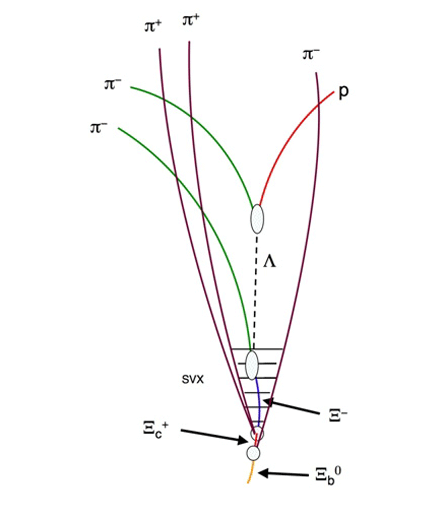 The CDF detector did not directly observe the neutral xi-sub-b, which breaks down almost immediately. Instead, the detector spotted debris left behind by this decay — a shower of six lighter, longer-lived particles created during a complicated four-stage decay process.