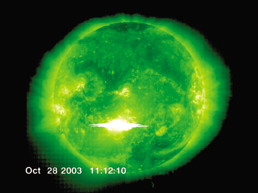 Oct. 14, 2003, dawned with a virtually spotless sun. It turned out to be the calm before the storm. During the next few days, the number and size of sunspots increased. On Oct. 18, a massive solar flare spewed from a newly visible sunspot near the eastern edge of the sun. The sun’s rotation carried this Jupiter-size zone of intense magnetic activity across the solar face and, on Oct. 23, another hyperactive spot of similar size spun into view. A third blemish popped up on the sun’s left cheek on Oct. 27, tripled in size by the next day, and then quickly doubled. At their largest, these three dark pocks and their smaller satellite blotches covered enough of the sun’s surface to cause a dip in solar radiation measurable by Earth-orbiting satellites.