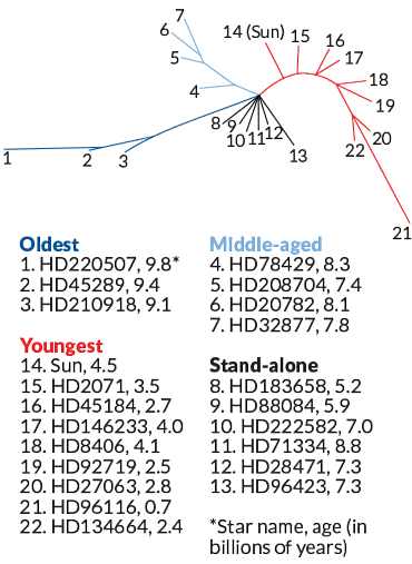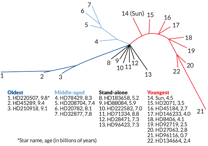 Borrowing techniques from biology, Paula Jofré and colleagues mapped out chemical relationships between the sun and 21 of its sibling stars. Three main branches emerged: younger stars in the Milky Way’s thin disk (red, including the sun), much older stars that could be in the Milky Way’s more dispersed thick disk (dark blue) and a third branch that lies in between (light blue). Six stars (black) had no clear relationship to the others, but more observations could help tie them in.