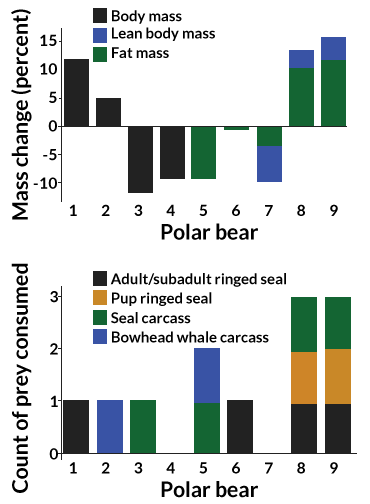 Female polar bears prowling springtime sea ice have extreme weight swings, some losing more than 10 percent of their body mass in just over a week. And the beginnings of bear video blogging help explain why.