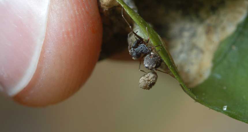 Ninjalike as pelican spiders are, they’re not the stuff of nightmares. “I’ve never had one try to bite me,” Wood says. When she reaches to catch them, they just drop to the ground. “They’re very shy.”