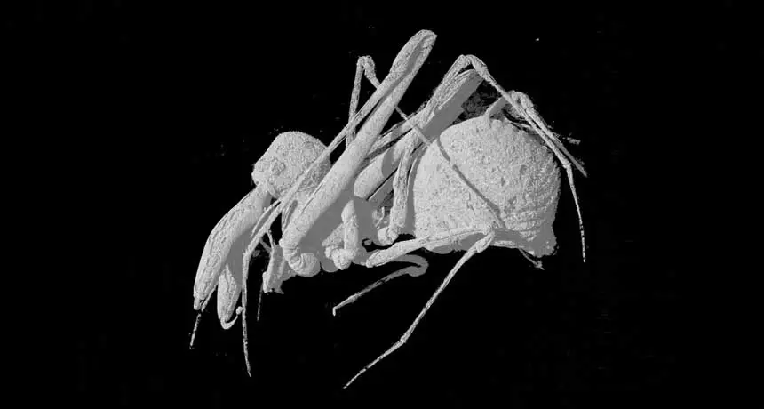 The pelican name comes from their profiles. “They look like little birds,” says Hannah Wood of the University of California, Davis. The spider’s body is about the size of a grain of rice, with a front segment that has evolved into a stretched “neck” with a little round “head” on top. (The mouth is actually at the bottom of the “neck”). And a pair of jawlike fanged projections called chelicerae folds down against the neck, where a pelican would tuck its beak.