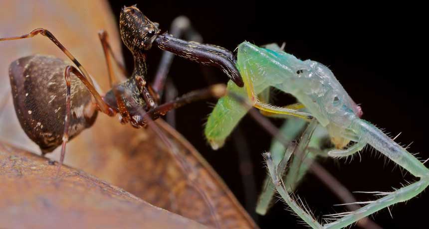 AT ARM’S LENGTH Pelican spiders hunt other spiders, plucking at their webs to lure the prey closer and then using long necks and jaws to hold them at a distance.