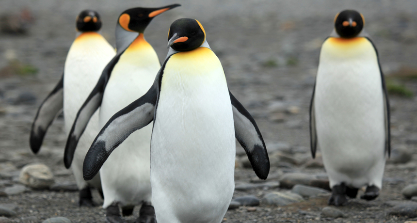 COMMON GROUND Penguins, such as these king penguins, may have had a common ancestor that lived about 20 million years ago in Antarctica. The main groups of living penguins began diverging between 16 million and 11 million years ago, a study finds.