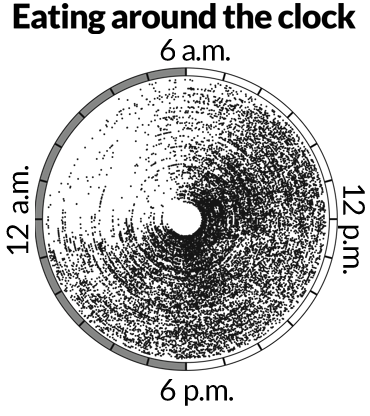It’s not clear how much time people should spend eating each day, he says. “What’s the optimal time window, and is it global or is it individual?” Woolf and colleagues at several institutions hope to launch a similar tracking study this fall to study 10,000 to 40,000 people at risk for developing diabetes. That study will use smartphone apps and activity monitors to help people track and perhaps change their eating and exercise habits for the better.