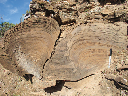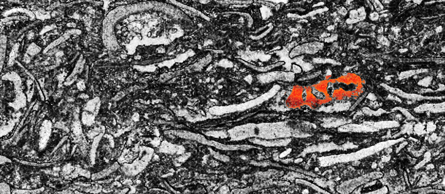 SPONGE BIT Shapes several millimeters across, like the one marked in red, might be cross sections of the oldest fossils of animal bodies yet found, from spongelike creatures preserved in Australian limestone. Maloof Lab/Situ StudioTWEENS Small fossils of what might be ancient marine sponges have turned up in the rocks between mounds of fossilized bacterial mats, or stromatolites, in the Trezona formation in south Australia.