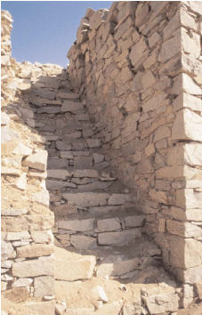 In a north-south line along the ridge, the flat-topped stone towers are evenly spaced, about 5 m apart. Though called towers, the structures are squat, varying in height from 2 to 6 m. Their rectangular tops are 11 to 13 m long and 6 to 9 m wide. Each tower has two sets of narrow stairs that lead to its top. From there, the eye takes in a landscape of foothills and mesas.