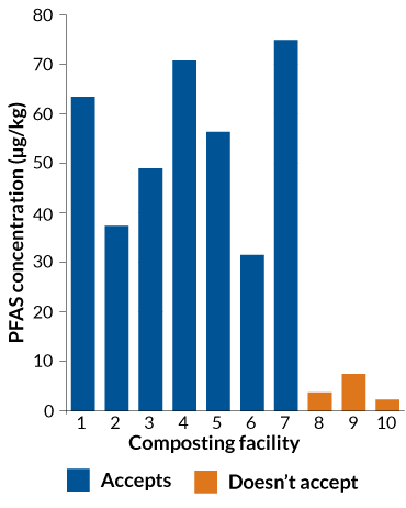 The scientists measured perfluoroalkyl acids, or PFAAs, a subset of PFAS formed by microbial degradation, in compost from 10 commercial facilities. Seven of these facilities accepted compostable food containers, and three didn’t. With the food containers in the mix, the team measured PFAAs at concentrations from about 29 to 76 micrograms per kilogram of compost, while compost from facilities that didn’t accept the containers contained less than 8 micrograms PFAAs per kilogram of compost.