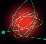 Like a tiny cartoon superhero taking on a huge bully, a photon grabs a passing atom and whirls it in erratic loops.