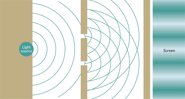 MEANDERING LIGHT A new study quantifies the amount of light that takes a circuitous route (such as the purple one) through three slits. Traditionally physicists have accounted for paths involving only one slit per photon (green).