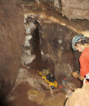 DEEP EVOLUTION Homo naledi fossils were found in South Africa’s Dinaledi Chamber, outlined here. Researchers debate whether this species dropped its dead through a shaft into the underground space, creating the array of bones shown on the chamber floor.