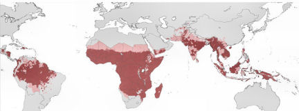 Red shading identifies zones where people live at high risk of malaria caused by the parasite Plasmodium falciparum, which causes the most severe disease. Pink shading denotes where P. falciparum malaria is less frequent but still prevalent. Scientists at the University of Florida in Gainesville and at Oxford University–Wellcome Trust in Nairobi, Kenya, and Oxford, U.K., note that roughly 2.4 billion people live in these at-risk areas. Their report appears in the February PLoS Medicine.