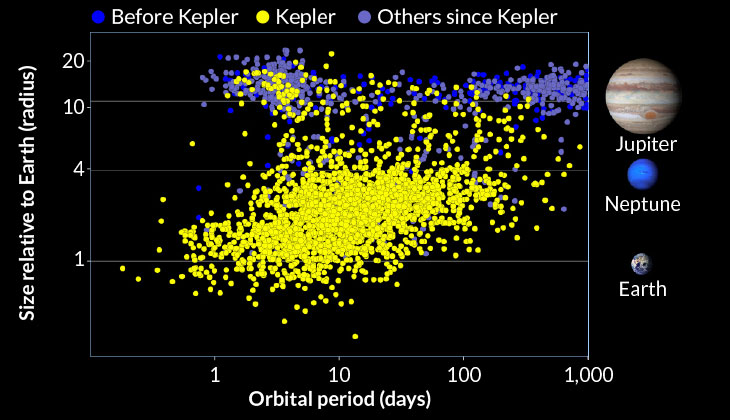 The Kepler space telescope launched in 2009. By the end of 2017, it had discovered more than 2,500 planets (yellow), about 70 percent of all exoplanets known. Known exoplanets range in sizes, from those comparable with Earth to the sizes of Neptune or Jupiter or even larger.