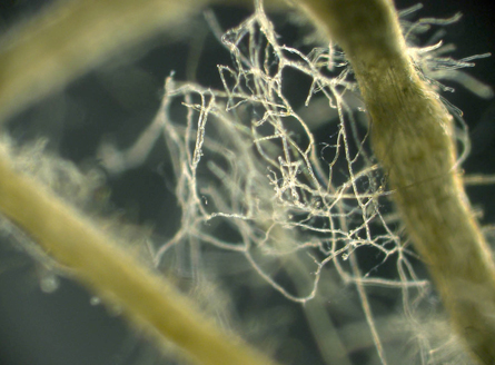 TRADING ROOTS Threads of mycorrhizal fungi (white) connect to the roots of their plant hosts.