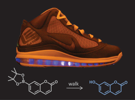 The research team squeezed various polymers, including the plastic PVC and the silicon-based polymer PDMS. When the scientists added gold and silver metal salts to a PDMS tube filled with water, squeezing the tube powered reactions that generated gold and silver nanoparticles. The researchers also injected the sole of a Nike LeBron sneaker with water and a compound that fluoresces when it is cleaved. Half an hour of walking applied force to the polymers in the sneaker’s sole, and the resulting free radicals made enough hydrogen peroxide to cleave the fluorescing compound and make the sole glow.