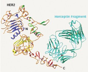 As researchers seek better drugs for breast cancer, they have a revealing new picture that could guide their way. It shows where the breast cancer drug Herceptin binds to and inhibits the protein HER2 on cancer-cell surfaces.