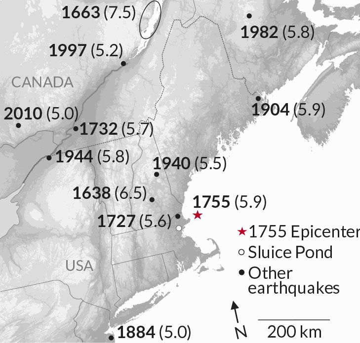The layers of a sediment core show a change around the time of the 1755 Cape Ann earthquake