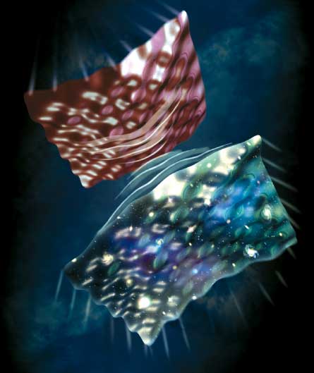 When they are separated, the two branes are perfectly wrinkle-free, representing a universe nearly devoid of matter. As the two branes pull closer, they develop tiny wrinkles. These wrinkles are the seeds of galaxies. When the branes finally collide and bounce apart, they unleash an enormous amount of energy, some of which is converted to matter and radiation. To an observer on one of the branes, this Big Bounce would look just like a Big Bang (SN: 9/22/01, p. 184).